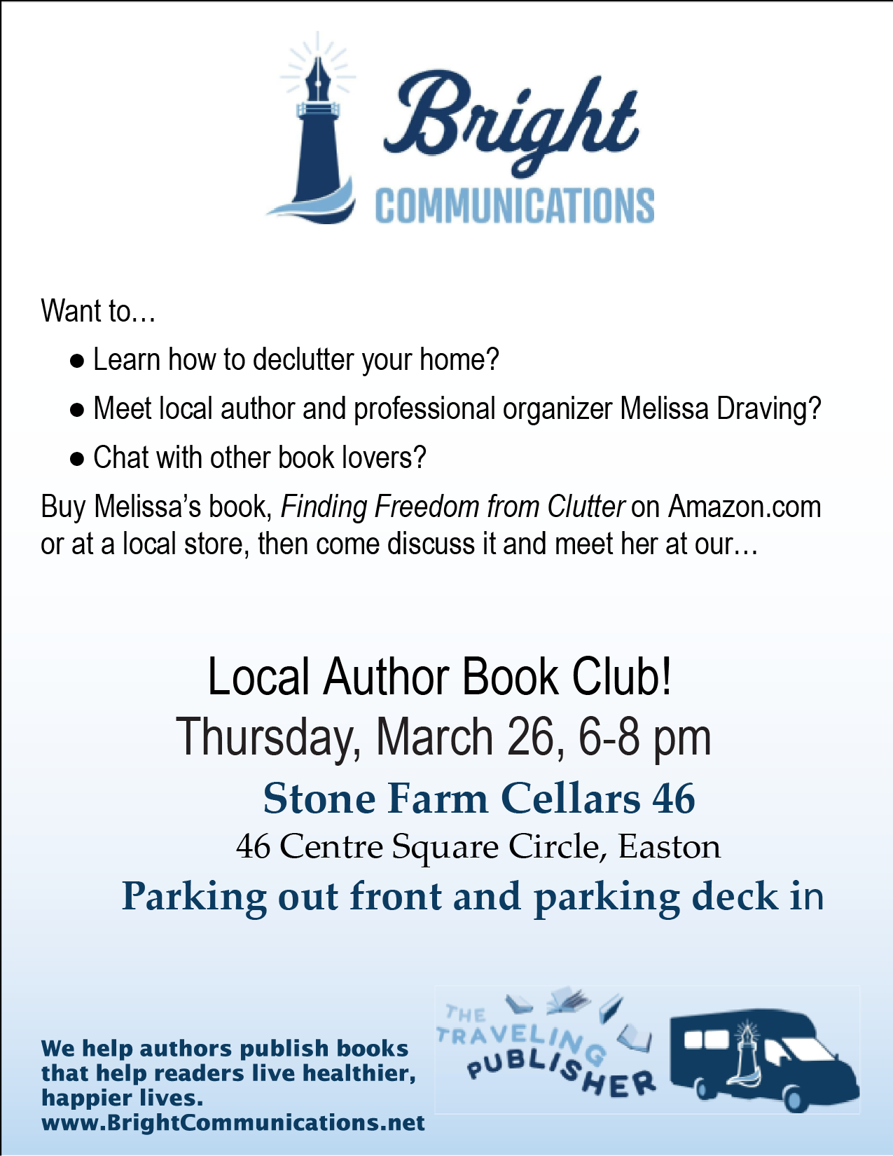 46 - Local Author Book Club Wednesday, March 26, 2025 6:00 PM 8:00 PM Stone Farm Cellars 46 46 Centre Square Circle Easton, PA, 18042 United States (map) Google Calendar ICS Join us a Stone Farm Cellars 46 on Thursday, March 26th from 6:00pm-8:00pm. Meet local author and professional organizer, Melissa Draving! Chat with other book lovers and learn how to declutter your home. We look forward to seeing you there!